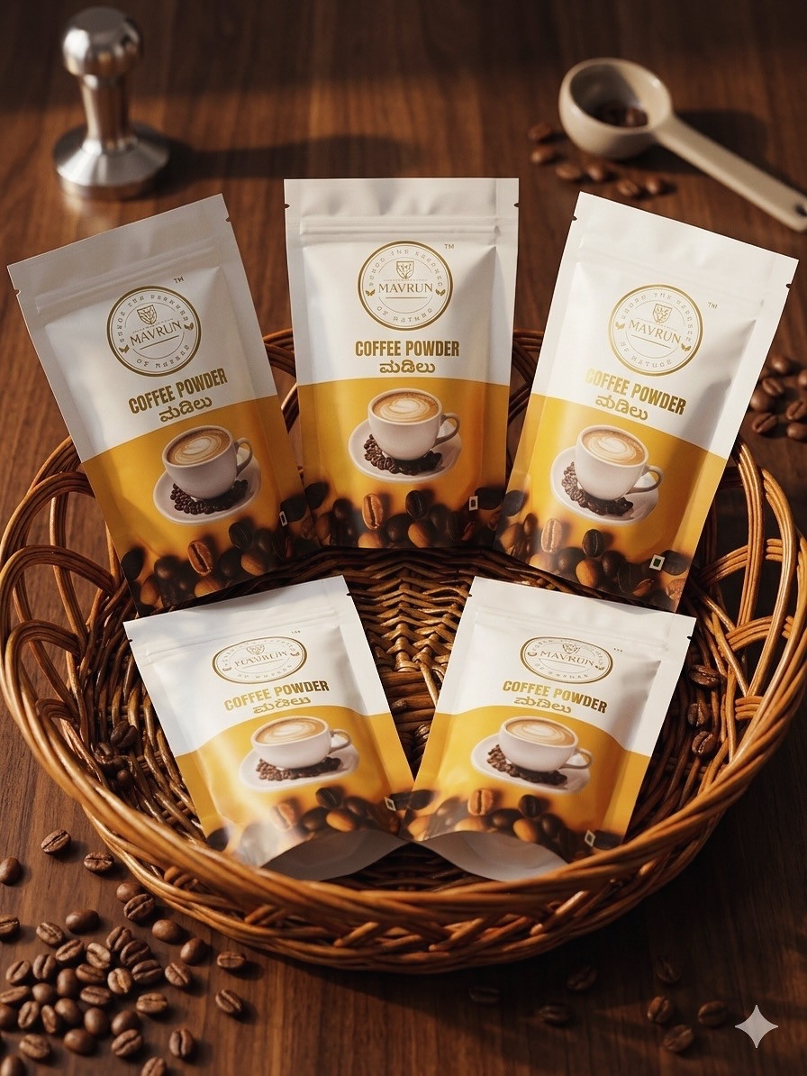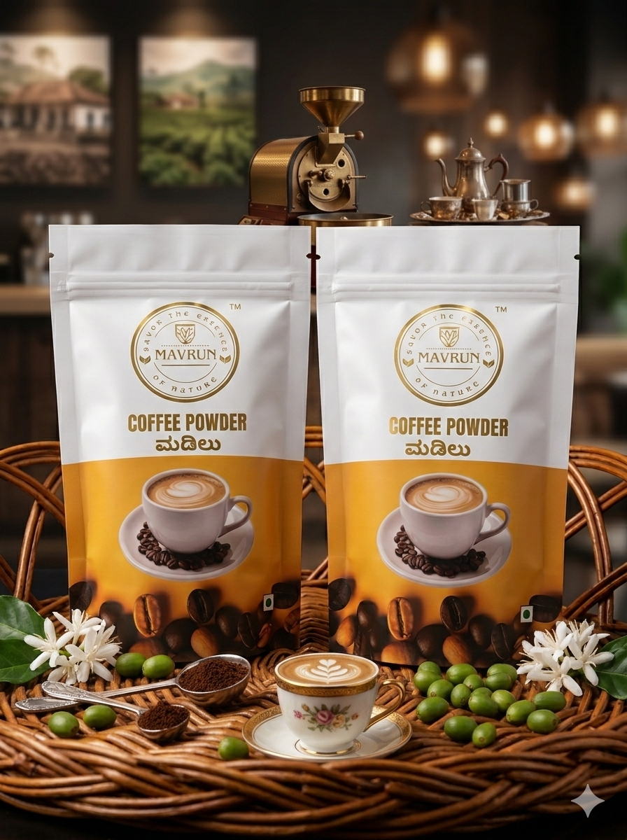 MAVRUN Filter Coffee Powder – where tradition meets luxury . A rich blend born from the lush plantations of Mudigere Chikkamagaluru madilu plantation. Our beans are carefully handpicked, slow-roasted, and freshly ground to capture the perfect balance of aroma, strength, and smoothness. Brew it, sip it, and feel the elegance of authentic South Indian coffee culture.