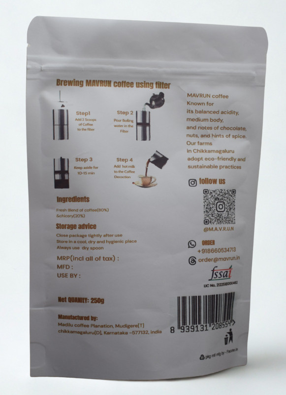 MAVRUN Filter Coffee Powder | 250gm Pouch | 80% Coffee - 20% Chicory | Chikkamagaluru Traditional South Indian | Roasted Ground| Smooth Flavour and Rich Aroma | No artificial flavours or preservatives | Eco-friendly, pesticide-free sourcing